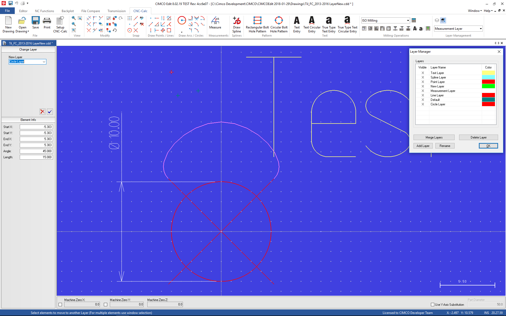 Nejnovější verze programu CIMCO CNC-Calc obsahuje podporu vrstev. Vrstva je kontejner pro seskupení souvisejících prvků ve výkresu a výkres může mít tolik vrstev, kolik je nutné. Vrstvy mají také různé atributy, jako je barva a viditelnost, které slouží pro zachování přehlednosti.