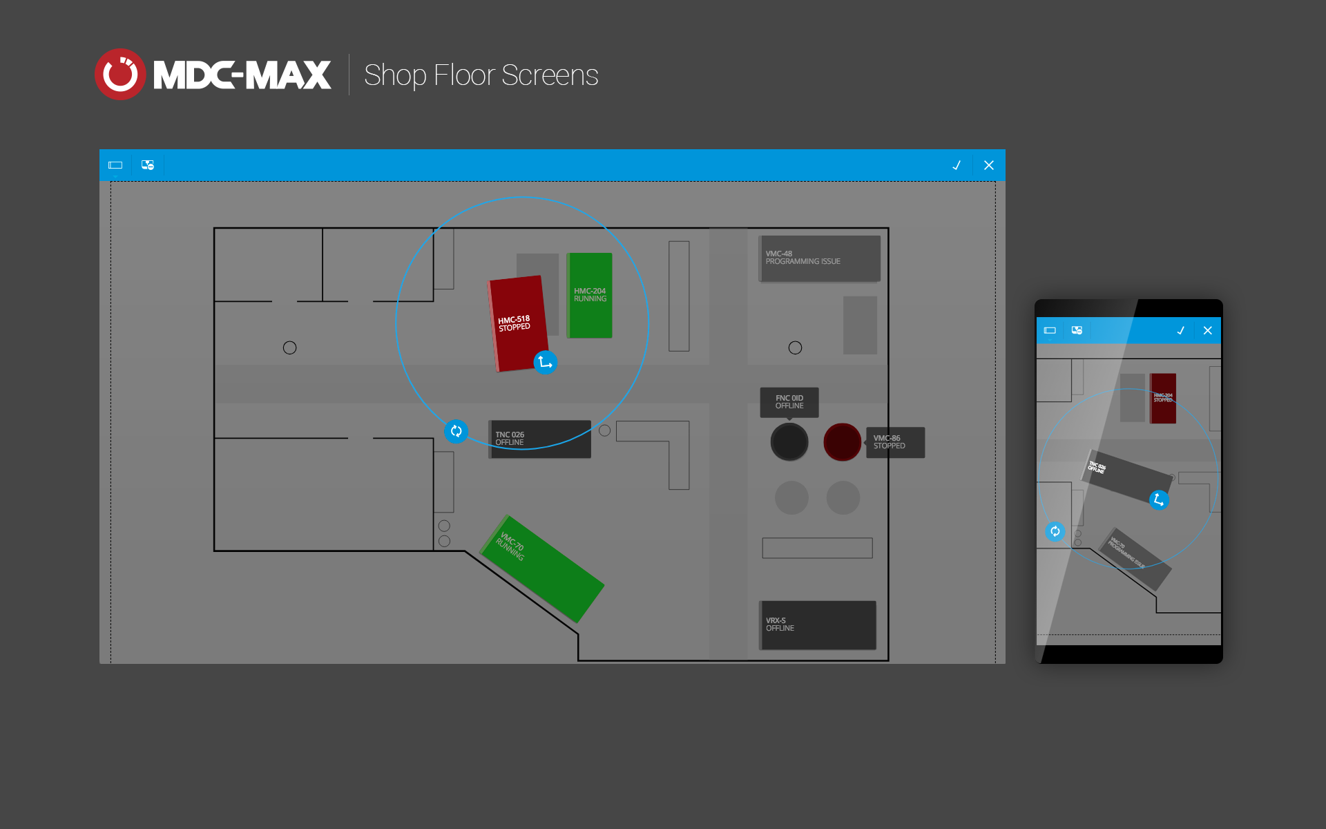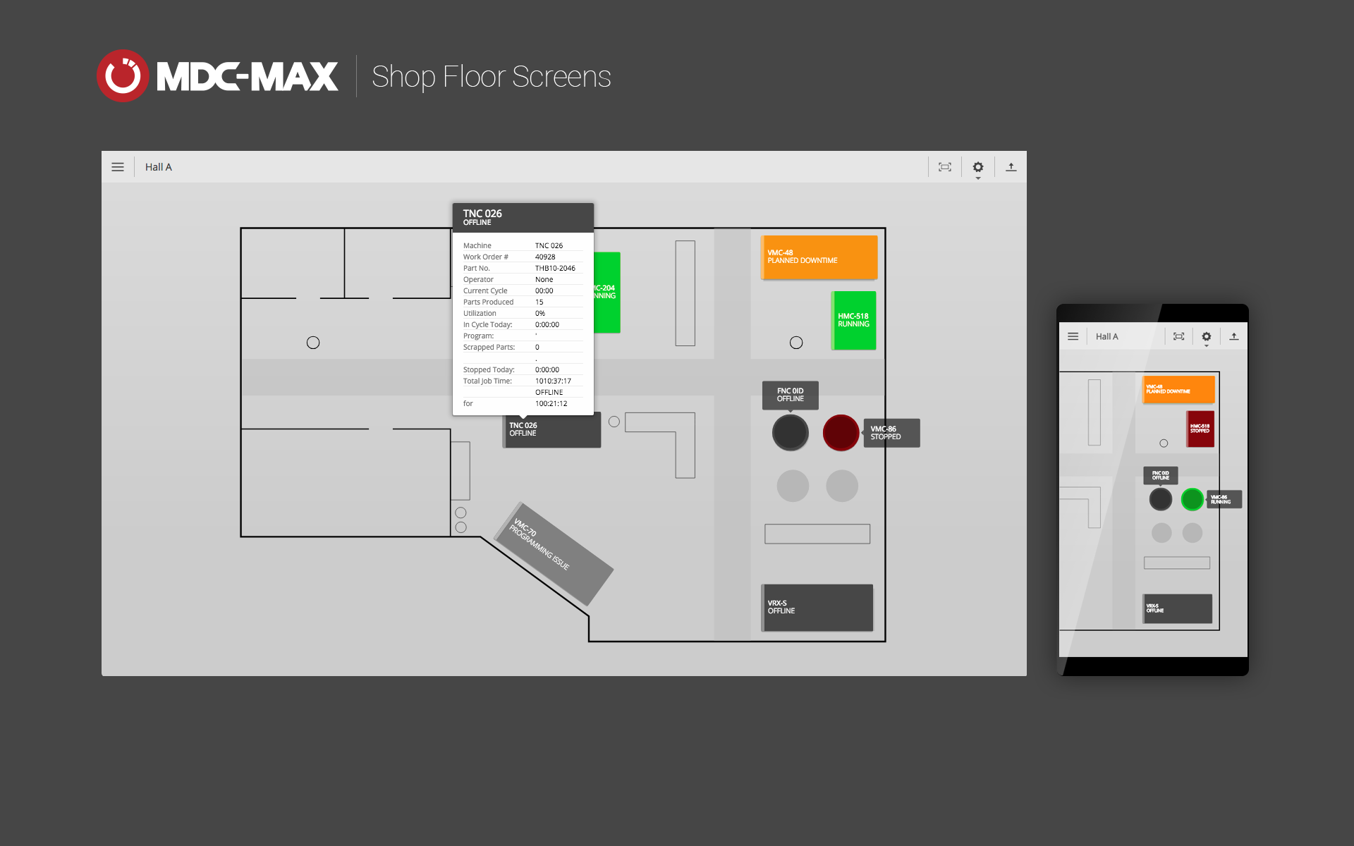 Obrazovky jsou dostupné z libovolného zařízení včetně počítače, tabletu, mobilního telefonu a televizoru. Na přístroji s dotykovým displejem je obrazovka Shop Floor podpořena standardními gesty včetně přetažení a přiblížení - stejně tak, jako funguje většina moderních aplikací s mapami. Klikem na libovolný stroj se okamžitě zobrazí okno s dalšími aktuálními údaji o stroji.
