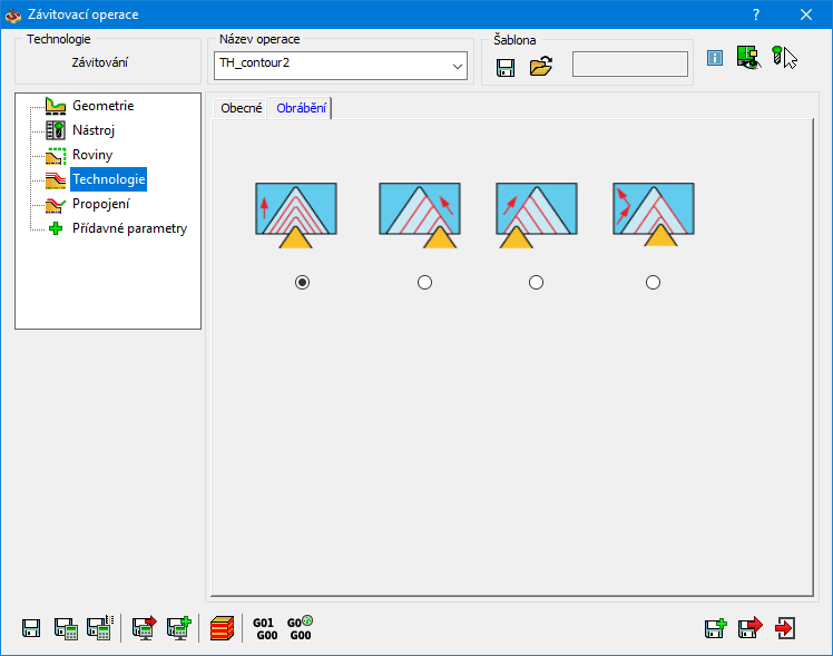 Závitování podélných (vnějších/vnitřních) i čelních závitů. Pro definici závitů je možné využít vnitřní editovatelnou databázi závitů. Možná volba definice stylu režimu závitovacího cyklu.