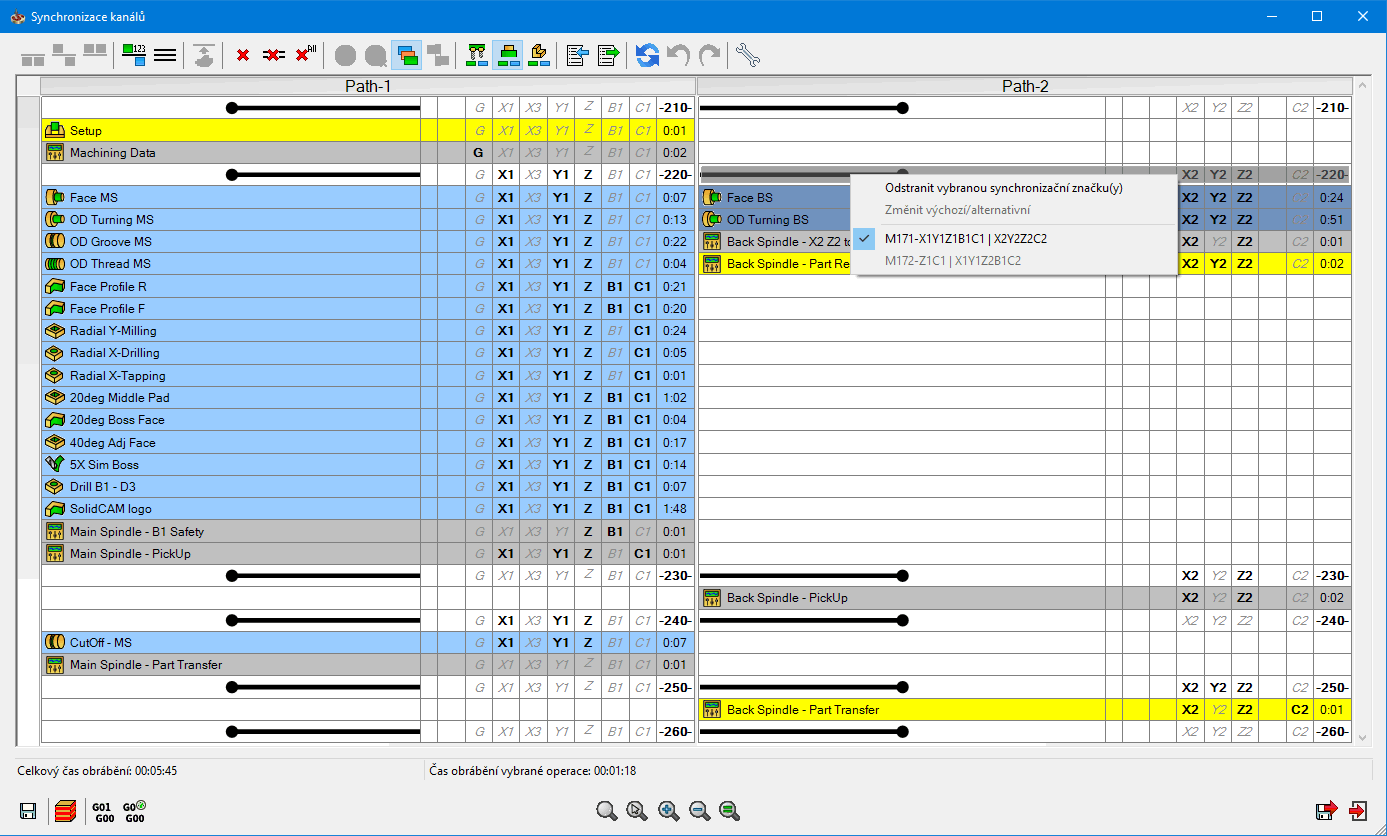 Synchronizace jednotlivých operací dle kanálů probíhá přes okno, kde je vidět časová závislost jednotlivých operací. V tomto okně je možné uspořádání operací dle jednotlivých požadavků určených programátorem. Je zde k dispozici i zobrazení operací, které svojí definicí nedovolují společnou synchronizaci.