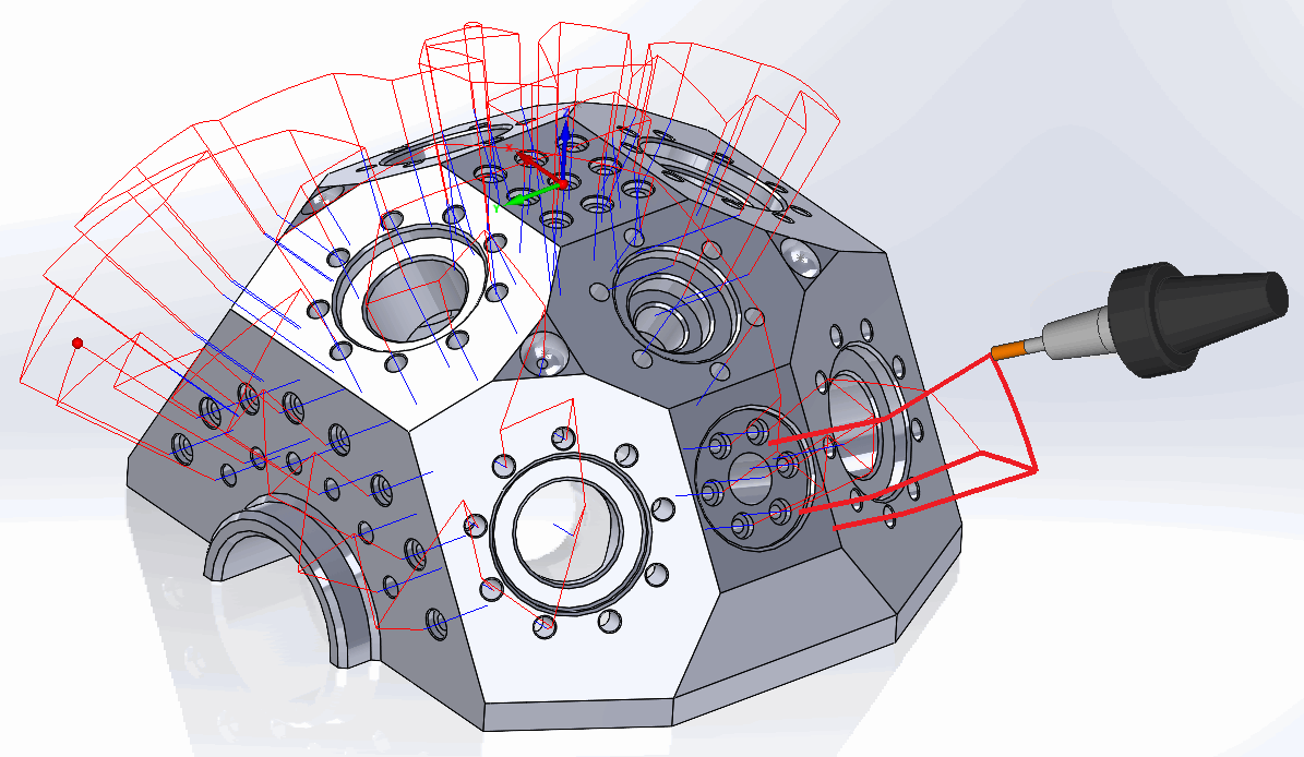 Modul Multi Axis Drilling generuje dráhu nástroje vrtání detekcí (rozpoznávání prvků) geometrií otvorů v součásti a poté vytvořením pohybů vrtání. Dráhy nástrojů lze provádět ve 4 osách a 5 osách.